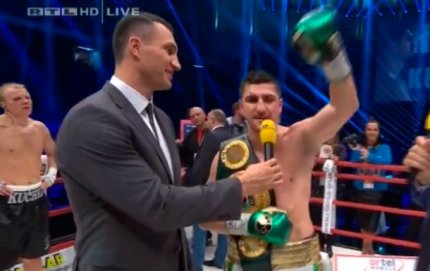 1:20. на бое присутствовал и Владимир Кличко. Наш знаменитый боксер поднялся в ринг и поделился своими впечатлениями о поединке. Владимир сказал, что в первых раундах был равный бой, а во второй половине боя Хук владел преимуществом