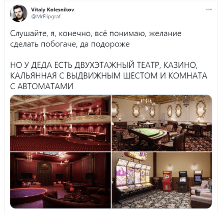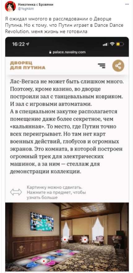 Фонд борьбы с коррупцией Алексея Навального, после ареста оппозиционера, обнародовал новое сенсационное расследование о президенте Росси Владимире Путине. В нем идет речь о путинском дворце на берегу Черного моря, который расположен в Геленджике. В ФБК отметили, что это самый большой частный дом в России, его площадь сравнима с территорией 39 княжеств Монако. А стоит этот дворец около 100 млрд рублей (примерно 1,35 млрд долларов). В Фонде Навального подчеркнули, что это самое охраняемое место в России, фактически государство в государстве, и это самый большой путинский секрет, который оберегают сотни, даже тысячи человек. В Кремле уже отреагировали на новое расследование Навального о дворце Путина. Спикер Кремля Дмитрий Песков заявил, что никаких дворцов, конечно же, у Путина нет. Россияне массово комментируют дворец Путина в соцсетях. Оосбенно их покорил склад грязи, кальянная с подиумом и шестом для танцев и зал с танцевальным ковриком, передает ONLINE.UA.