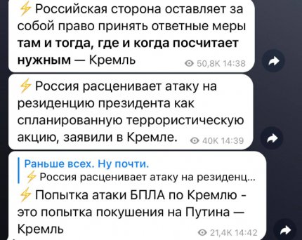 Сегодня ночью киевским режимом была предпринята попытка нанесения удара беспилотными летательными аппаратами по кремлевской резиденции президента. Два беспилотных летательных аппарата были нацелены на Кремль, - сказано в заявлении пресс-службы Путина.