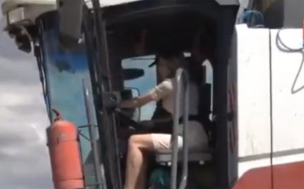 В сети опубликовано видео с крымской прокуроршей-"няшей" Натальей Поклонской, которая на камеру забралась в кабину зерноуборочного комбайна и сделала несколько заездов во время уборки зерна в Первомайском районе оккупированного Крыма.