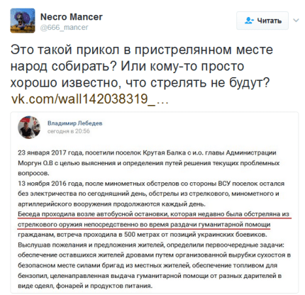 "Беседа проходила возле автобусной остановки, которая недавно была обстреляна из стрелкового оружия непосредственно во время раздачи гуманитарной помощи", – похвастался он.