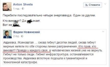 "Авдеевка, Ясиноватая…снова гибнут десятки людей, снова гибнут мирные жители по обе стороны линии разграничения. Кто прав, кто виноват? Правда у каждого своя, а человеческих жизней уже не вернуть. Гибнут не только люди. Гибнет инфраструктура, останавливаются производства. Авдеевка вплотную подошла к гуманитарной и техногенной катастрофе", - написал на своей странице в Facebook нардеп.