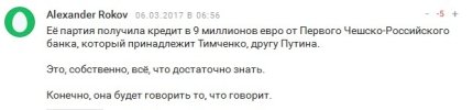 Интересно, что на вопрос, не влияет ли на ее мнение о президенте России то, что три года назад она получила кредит в российском банке на 11 млн долларов, Ле Пен заявила, что у нее нет никаких обязательств перед Россией, кроме выплат по кредиту.