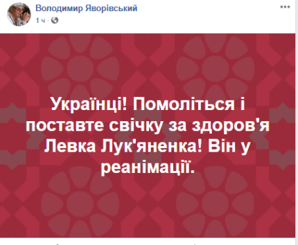 Яворивский призвал украинцев помолиться за здоровье выдающегося деятеля, но не уточнил, что стало причиной госпитализации Лукьяненко в реанимацию.