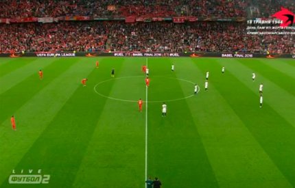 21:42. футболисты на поле. Слушаем гимн Лиги Европы