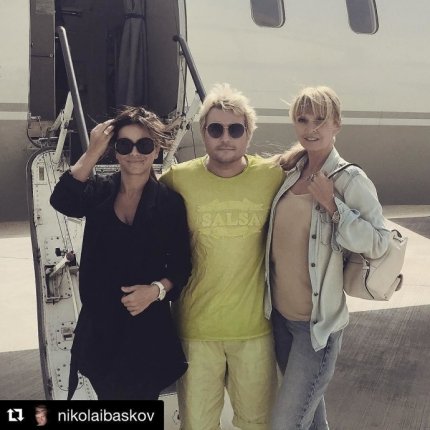 На снимке певица стоит возле трапа самолета в окружении российских коллег - Валерии и Баскова.
