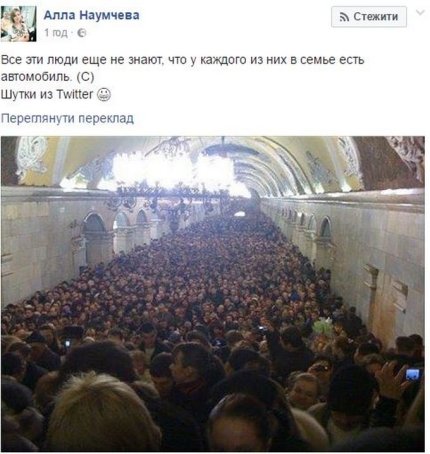 Так, активистка опубликовала фото огромной толпы людей в одном из московских метро. "Все эти люди еще не знают, что у каждого из них в семье есть автомобиль", - прокомментировала фото она.