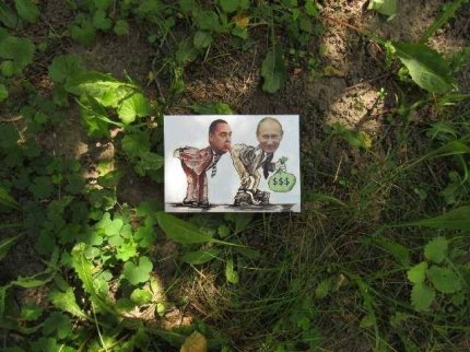 В оккупированном боевиками Первомайске Луганской области партизаны разбросали листовки, на которых изображен главарь ЛНР Игорь Плотницкий, целующий в зад президента России Владимира Путина.