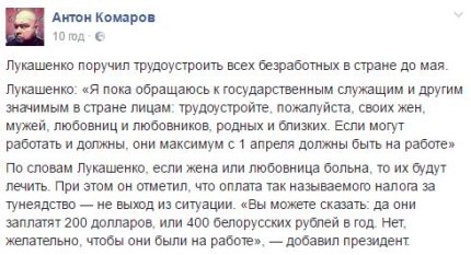 "Хочу, чтобы услышали меня сидящие здесь и те, кто меня услышит сегодня в СМИ. Я пока обращаюсь к государственным служащим и другим значимым в стране лицам: трудоустройте, пожалуйста, своих жен, мужей, любовниц и любовников, родных и близких. Тех, кто должен и может работать. Если жена или любовница больна, ну что же, будем лечить. Если могут работать и должны, они максимум с 1 апреля должны быть на работе", - заявил Лукашенко.