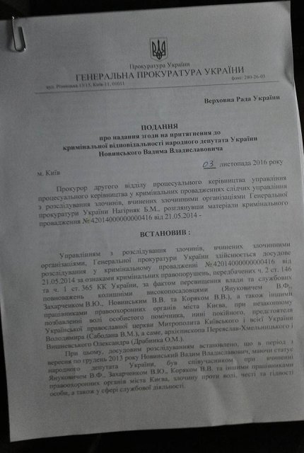 Как говорится в тексте постановления, следователи Генпрокуратуры установили, что Новинский был соучастником в похищении личного помощника покойного предстоятеля УПЦ Владимира, архиепископа Переяслав-Хмельницкого и Вишневского Александра Драбинко.