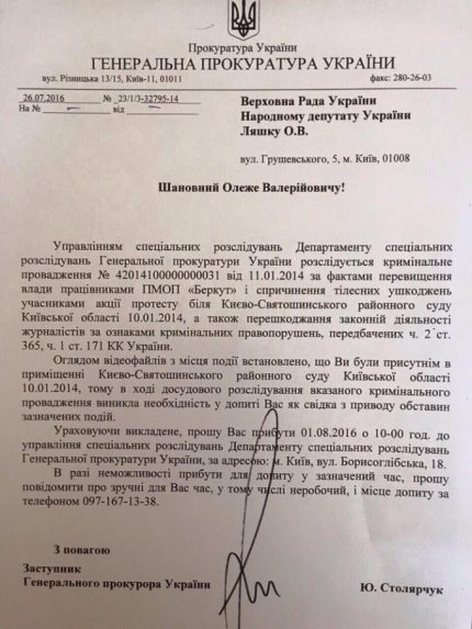 Согласно документу, нардеп вызывается на 10:00 1 августа на допрос в качестве свидетеля в уголовном производстве "по фактам превышения власти работниками "Беркута" и нанесения телесных повреждений участникам акции протеста возле Киево-Святошинского райсуда 10 января 2014 года и препятствования деятельности журналистов за ч. 2 ст. 365 и ч. 1 ст. 171 УК Украины".