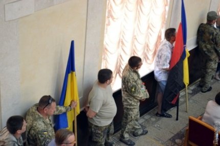Люди в камуфлированной униформе, которые представились бойцами добровольческих батальонов, сорвали сессию Одесского областного совета.