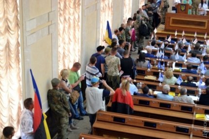 Депутаты согласились рассмотреть требования добровольцев на следующей сессии, однако их такой вариант не устроил. Председатель собрания Анатолий Урбанский объявил перерыв.