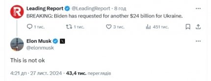 Журналисты обратили внимание на то, что Илон Маск в собственной соцсети Х прокомментировал сообщение, в котором указано, что Джо Байден "попросил еще 24 млрд долл для Украины".