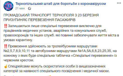 В Тернополе перевозить городским транспортом будут только работников, которые в условиях чрезвычайной ситуации обеспечивают жизнедеятельность города - это медики, работники органов государственной власти и местного самоуправления, коммунальщики, работники предприятий, обеспечивающих производство продуктов питания, сотрудники аптек, Укрпочты и аварийных служб. На въездах в Тернополь создадут санитарно-контрольные посты, где будут проводить температурный скрининг.