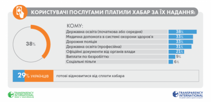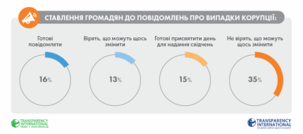 Согласно результатам опроса, которые приводит организация, 29% украинцев готовы отказываться платить взятку, 9% готовы сообщать о коррупции, 6% будут голосовать за добропорядочных кандидатов и партии, 7% готовы вслух обсуждать проблему коррупции, 2% готовы вступить в антикоррупционные организации, а 1% - бойкотировать недобропорядочный бизнес.
