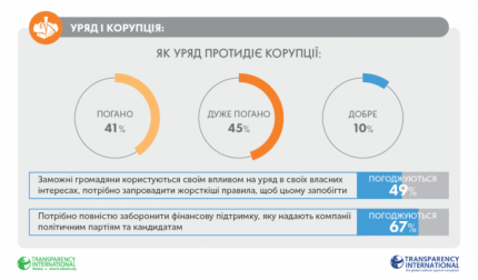Проблема коррупции до сих пор остается в тройке самых актуальных для Украины - об этом заявили 56% респондентов. На вопрос, снизился ли уровень коррупции за последние четыре года, 72% украинцев ответили отрицательно. Попытки правительства изменить эту ситуацию 86% опрошенных оценивают негативно. При этом 49% украинцев считают, что состоятельные люди влияют на правительство в собственных интересах, и предлагают ввести более жесткие правила, чтобы это предотвратить, а 67% уверены в необходимости запретить компаниям финансировать политические партии и кандидатов.
