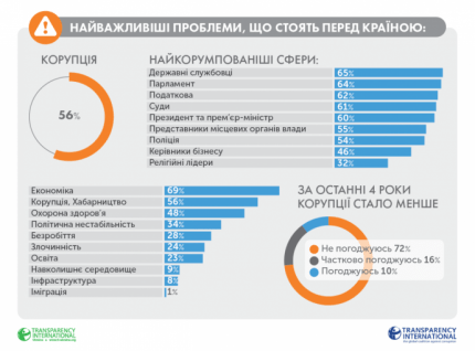 Наиболее коррумпированными украинцы назвали: государственных служащих (65%), парламент (64%), работников налоговой сферы (62%), судей (61%), президента и премьер-министра (60%), представителей местных органов власти (55%), полицию (54%), руководителей бизнеса (46%), религиозных лидеров (32%).