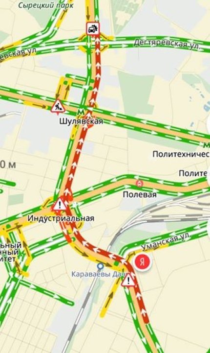 Также стоит «в пробке» улица Дегтяревская перед мостом.