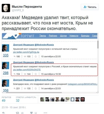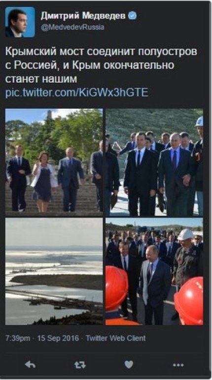 Сообщение российского премьера, проиллюстрированное фотографией со строительства Керченского моста, провисело в аккаунте Медведева несколько часов, а после этого было удалено.