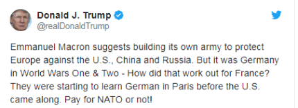 Президент США Дональд Трамп жестко отреагировал на идею Макрона об армии Европы, которую поддержала Меркель. Он написал резкий твит в соцсети, напомнив в нем о Первой и Второй мировых войнах.