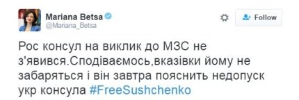 «Российский консул на вызов в МИД не явился. Надеемся, указания ему не заставят себя ждать и он завтра объяснит недопуск украинского консула (к Сущенко)", - написала Беца.