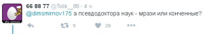 Известный российский блогер и журналист Олег Кашин в своем Facebook разместил скриншот сообщения Смирнова со словами Мединского и прокомментировал: «Мрази конченные!».