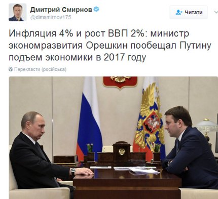 "Минэкономразвития по итогам 2017 г. ожидает рост ВВП около 2%, а инфляцию – на уровне 4%", - говорится в сообщении СМИ.
