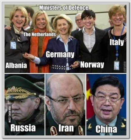 На опубликованном фотоколлаже показано, что министрами обороны Германии, Нидерландов. Норвегии, Италии и Албании являются привлекательные женщины, которые улыбаются, в то время как оборонные ведомства России, Ирана и Китая возглавляют мужчины без тени улыбки на лицах.