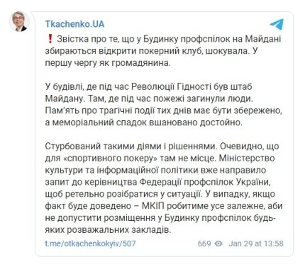 29 января глава Министерства культуры и информационной политики Александр Ткаченко официально сообщил, что уже направил запрос к руководству Федерации профсоюзов Украины относительно информации о возможном открытии покерного клуба в Доме профсоюзов на Майдане, который был штабом Революции Достоинства. По словам министра, новость о том, что в Доме профсоюзов на Майдане намерены открыть покерный клуб, его "шокировала в первую очередь как гражданина". Об этом информирует ONLINE.UA со ссылкой на сообщение должностного лица в Telegram.