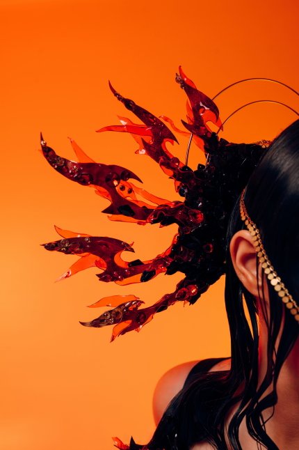 Пластиковые приборы использовались для крыльев, головного убора и корсета. Головной убор создан из кусков пластика и пластиковых ножей. Из листов пластика вырезались большие перышки — основа головного убора, после чего огнем им придавалась фактура и форма. Юбка — также ресайкл.