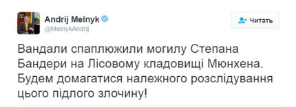 "Вандалы осквернили могилу Степана Бандеры на Лесном кладбище Мюнхена. Будем добиваться надлежащего расследования этого подлого преступления!", - написал Мельник.