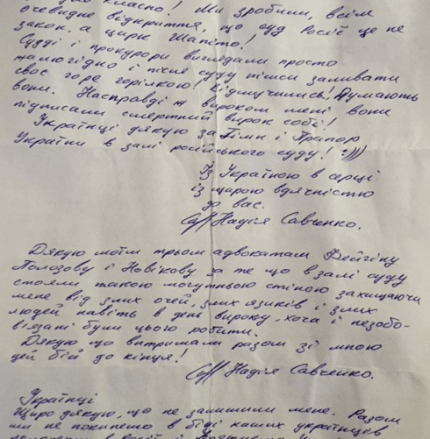 "Мы сделали всем очевидное открытие, что суд в России - это не закон, а цирк Шапито! Судьи и прокуроры выглядели просто жалко, и после суда пошли заливать свое горе водкой! Отмучились! Думают они. На самом деле приговором мне они подписали смертный приговор себе", - пишет в письме Надежда Савченко.