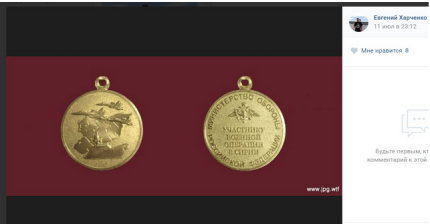 Еще одним свидетельством участия в "сирийской командировке" стал слайд с медалью МО РФ "Участнику военной операции в Сирии", который был загружен в июле 2016 г. на странице морпеха этого же батальона Евгения Харченко.