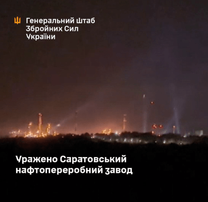 В ночь на 16 сентября 2025 года подразделения Сил специальных операций Вооруженных Сил Украины, во взаимодействии с другими составляющими Сил обороны, нанесли поражение по Саратовскому нефтеперерабатывающему заводу (Саратовская область РФ), — сказано в официальном заявлении Генштаба ВСУ.