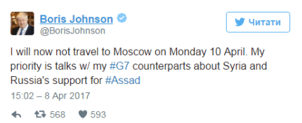 "Я не поеду с визитом в Москву в понедельник, 10 апреля. Мой приоритет – переговоры с моими коллегами по G7 о Сирии и российской поддержке Асада", - написал он.