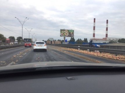 Южный мост в Киеве во вторник, 20 сентября, оказался засыпанным яблоками.