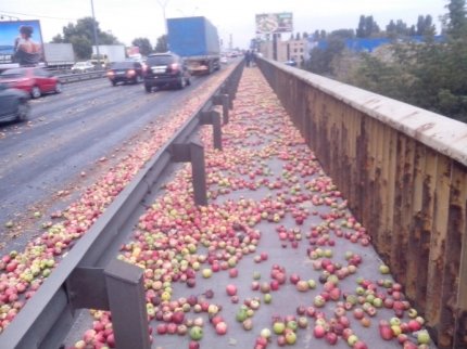 По словам свидетелей происшествия, задняя дверь фуры открылась, и яблоки посыпались прямо на проезжую часть.
