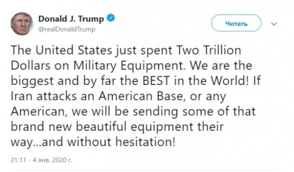Следует добавить, что перед этими угрозами Трамп заявил о готовности атаковать 52 иранских объекта в случае ударов Тегерана против американцев. В то же время командующий Корпусом стражей исламской революции (КСИР) генерал Хосейн Салами заявил, что ответ на убийство Соединенными Штатами иранского военачальника Касема Сулеймани будет включать в себя стратегическую месть Тегерана.