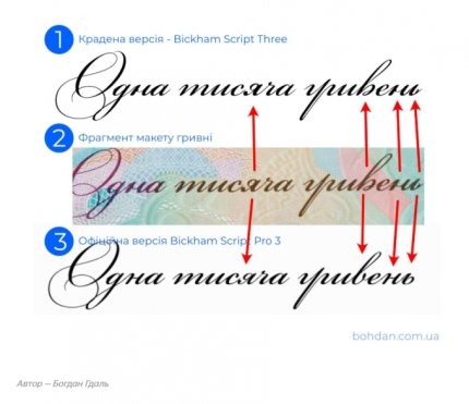 Национальный банк Украины применил неофициальную кириллизацию шрифта Bickham Script для надписи «Одна тысяча гривен» на соответствующей банкноте. Стоит отметить, что пиратскую версию сделала россиянка Александра Гофман. Об этом сообщил шрифтовой дизайнер Богдан Гдаль. Кроме того, данную информацию подтвердил шрифтовиков компании Adobe, которая имеет права на Bickham Script, Франк Грисхамер, передает ONLINE.UA из ссылки на "Telegraf".