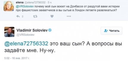 В ответ Соловьев написал: «Это ваш сын? А вопросы Вы задаете мне. Ну-ну».