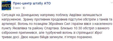 «Ситуация на Донецком направлении вблизи Авдеевки остается напряженной. Утром противник продолжил коварные обстрелы из танков и артиллерии. Огонь по позициям Вооруженных Сил Украины велся из населенного пункта Яковлевка и района Спартака», - сообщили в пресс-центре штаба АТО в Facebook.