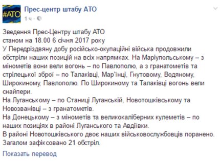 Такие данные в штабе АТО опубликовали по состоянию на 18:00 6 января 2017 года.