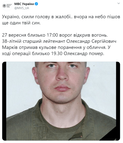 Известно, что трагедия произошла около 17 часов 27 сентября, когда боевики открыли огонь по позициям Объединенных сил. Сообщается, что 38-летний украинский военный получил пулевое ранение в лицо.