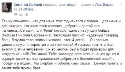 "Полк "Киев" потерял одного из лучших бойцов Войтова Николая Сергеевича! Настоящий патриот, надежный товарищ, боец, безумно талантливый человек, отец 4 детей... Он прожил удивительную, интересную и полную жизнь! Я горжусь тем, что был знаком с этим человеком! Он во многом был и будет примером для каждого из нас!!! Позывной "Ребе" навсегда останется в наших душах и сердцах таким же жизнерадостным добряком с бесконечной верой в победу и в людей...", - написал Дейдей.