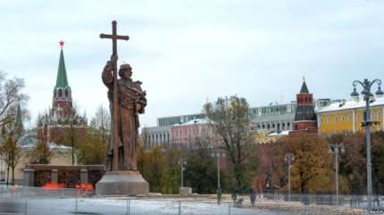 В сети высмеяли фото памятника князю Владимиру в Москве, который держит крест напротив Кремля.