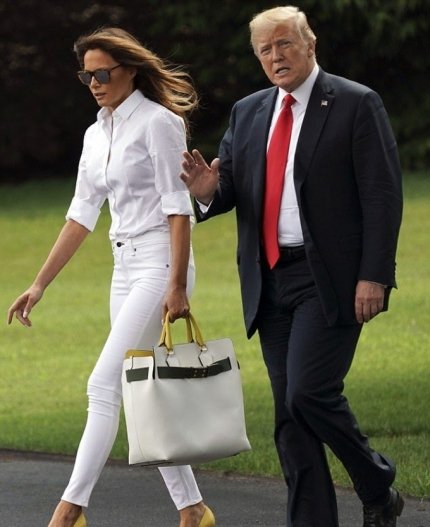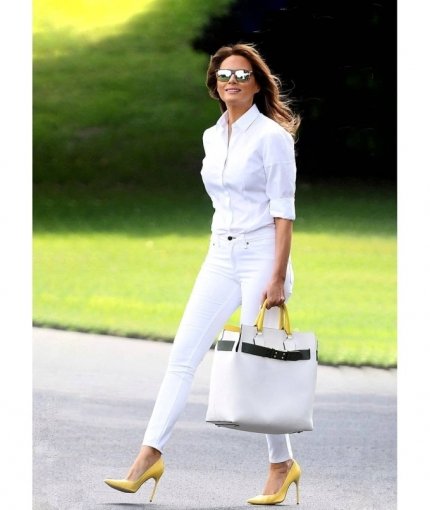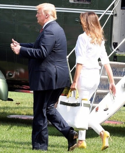 Отметили поклонники и яркие аксессуары, которые первая леди США выбрала к летнему look - сумку с желтыми вставками от Burberry и солнцезащитные очки. Удивились фанаты Мелании и тому, как она в очередной раз с легкостью прошлась по газону в туфлях на высоких каблуках.