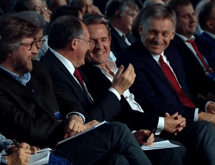 На заседании международного дискуссионного клуба "Валдай" в Сочи, где выступал президент России Владимир Путин, бывший глава Администрации экс-президента Украины Леонида Кучмы Виктор Медведчук сидел в первом ряду рядом с пресс-секретарем российского президента Дмитрием Песковым.
