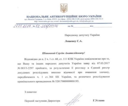 В НАБУ сообщили, что заявление депутатов принято и по результатам его рассмотрения в Единый реестр досудебных решений внесены сведения о совершении преступления, предусмотренного ч.1 ст.364 УК Украины, и начато уголовное производство.