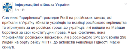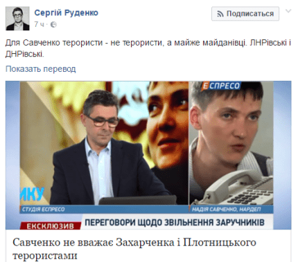 "Т.е. она на голубом глазу приравняла людей, которые стояли на Майдане к российским боевикам типа Моторолы. Революцию Достоинства к иностранному вторжению. Януковича к Порошенко. А солдаты АТО, которые гибли и гибнут - получается зря всё, раз там не террористы, а чуть ли не братья по духу и сплошные философы? После такого даже Киселёв с Соловьём нервно закурили в стороне и зауважали Надежду за профессионализм. А что, звучит: "Итоги недели с Надеждой Савченко на Первом канале". Ждите", - считает российский журналист Александр Тверской.